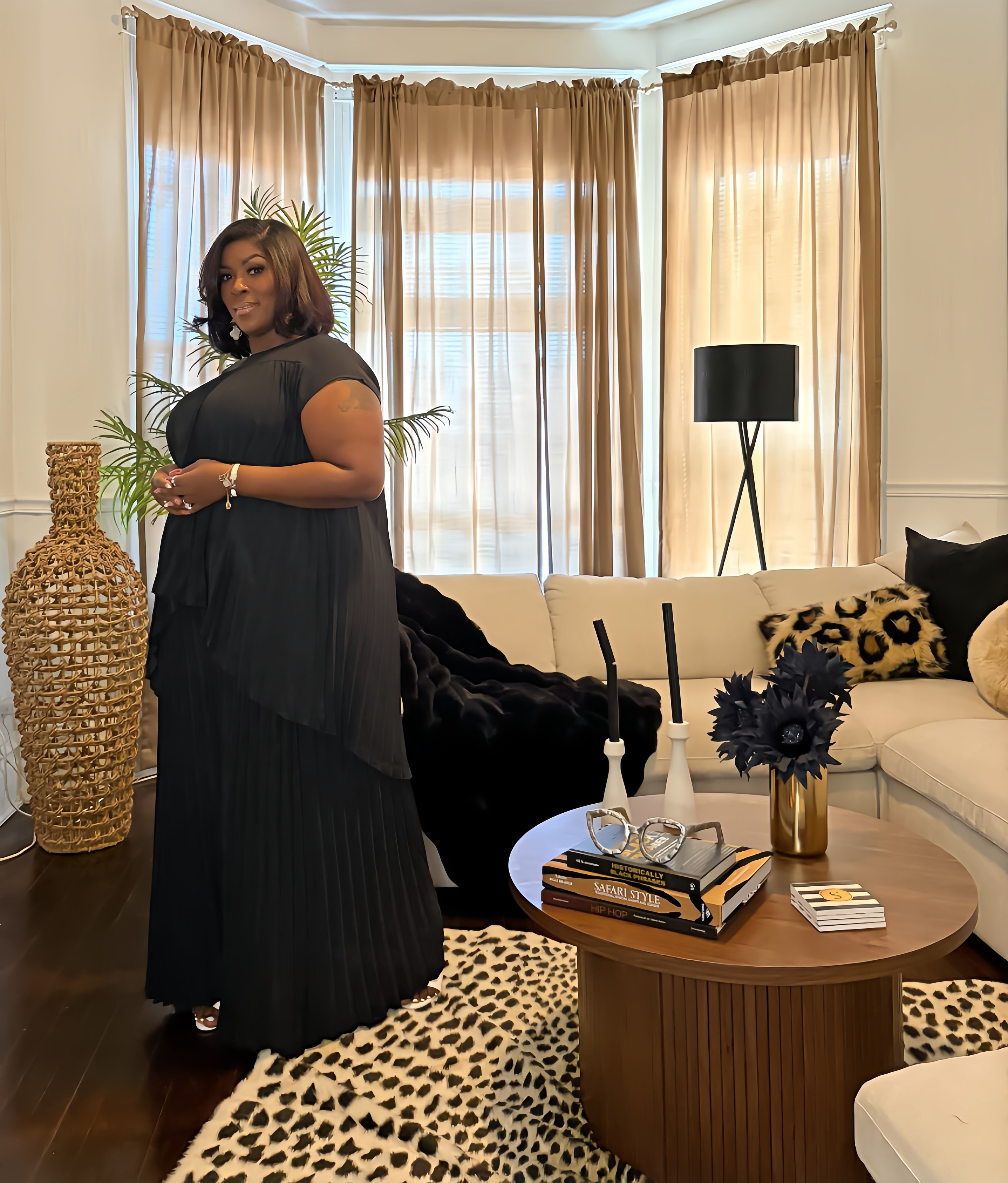 Pleated two piece pant set with sleeveless round neck top. Runs large model normally wear 2X