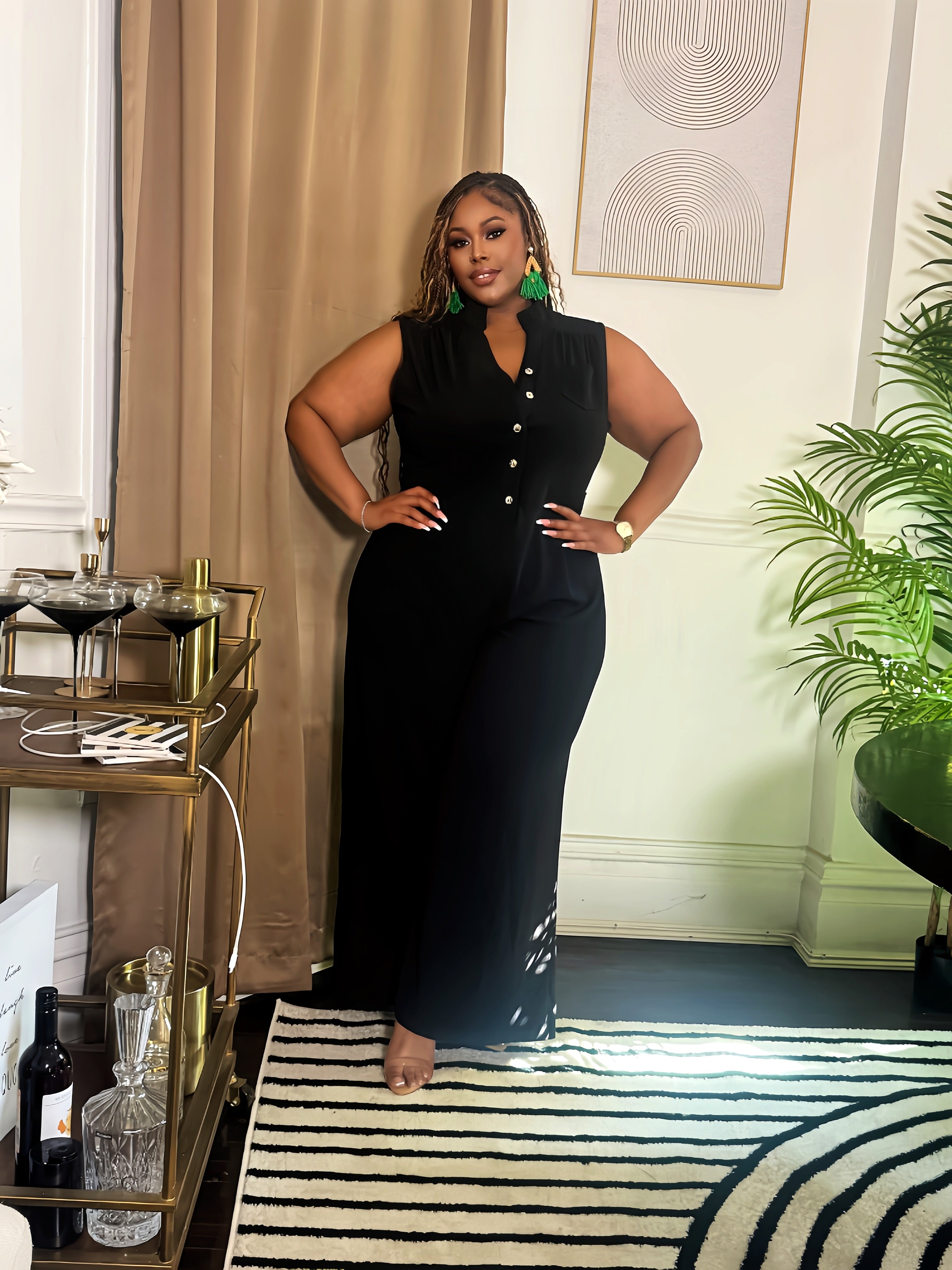 Solid color sleeveless, button up details wide leg jumpsuit with pockets runs a tad bit small size up